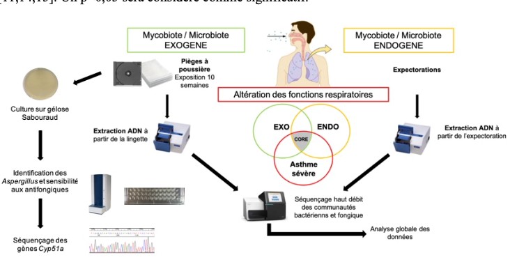 1. Évaluer l’évolution du mycobiome pulmonaire au cours de l’asthme, de la BPCO et de la mucoviscidose, notamment lors des exacerbations;