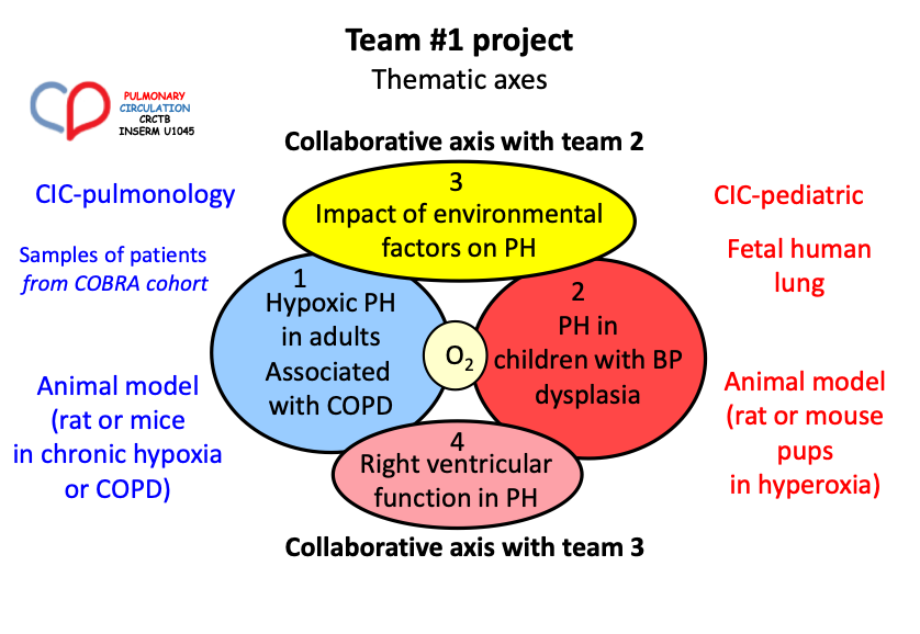 The main objective of our team is to study the pathophysiology of the pulmonary circulation in adults and children, with a particular focus on the impact of environmental factors. Our research is centered on pulmonary hypertension (PH), which may be associated with chronic obstructive pulmonary disease (COPD) in adults, or with bronchopulmonary dysplasia (BPD) in extremely preterm newborns which also have long-term pulmonary and cardiovascular consequences into adulthood.
